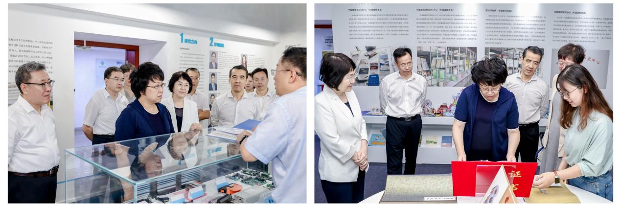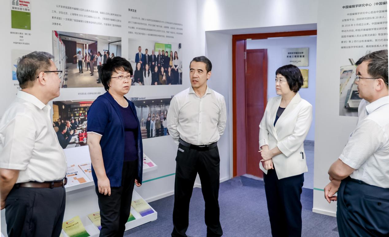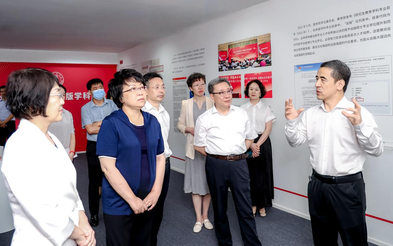 翁铁慧一行参观了学校出版学科展,深入了解了学校以服务国家战略和出版业高质量发展为导向,围绕中宣部首批出版学科共建会议“发挥专业院校长期扎根出版、深耕出版全产业链办学优势,进一步贴近行业需求做强优势学科”的要求,集全校之力积极构建“出版理论研究为本、出版融合研究为先、出版实务研究为用、出版治理研究为要”的多学科交叉融合的特色出版学科体系情况,听取了“出版理论与历史、出版编辑、数字出版、出版管理、版权保护与运营、出版技术应用、出版美学”七个学科方向的系列成果介绍。
